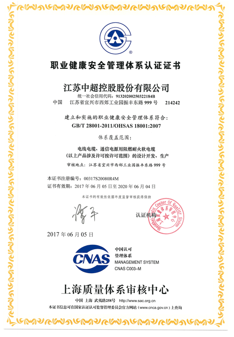 職業健康安全管理體系認證證書