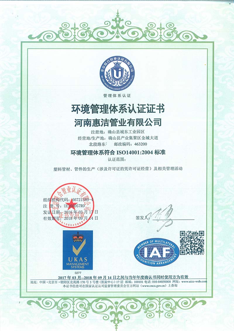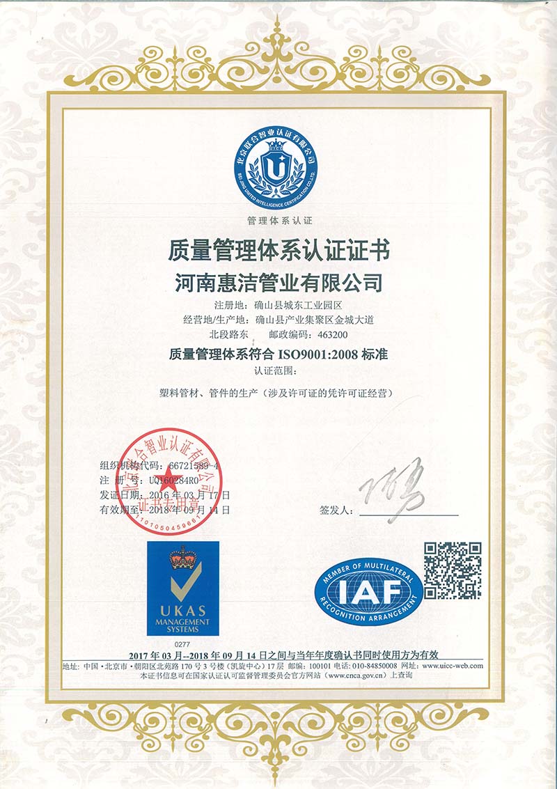河南惠潔管業(yè)有限公司是一家專業(yè)從事高分子材料及其制品研究開發(fā)、生產(chǎn)制造、銷售、安裝一體的高新技術(shù)企業(yè)。公司成立于2007年,總投資六億五千萬元,注冊資金12030萬元。產(chǎn)品涵蓋了聚乙烯(PE)、聚丙烯(PP)、聚丁烯(PB)、聚氯乙烯(PVC)等四大系列,一千多種規(guī)格型號。其中PE無塔供水設(shè)備是我公司自主研發(fā),自主創(chuàng)新的綠色環(huán)保節(jié)能產(chǎn)品,獲得了六項國家專利,并起草實(shí)施了行業(yè)標(biāo)準(zhǔn)。公司擁有駐馬店市特種塑料制品工程技術(shù)研究中心,獨(dú)立產(chǎn)品檢驗、試驗中心,設(shè)備先進(jìn),技術(shù)一流;企業(yè)全面通過了ISO9001:2008質(zhì)量管理體系,ISO14001:2004環(huán)境管理體系,GB/T28001:2001職業(yè)健康安全管理體系認(rèn)證;獲得了國家質(zhì)量監(jiān)督檢驗檢疫總局“特種設(shè)備制造許可”認(rèn)證;先后榮獲了“中國著名品牌”“國家AAA級企業(yè)”“河南省著名商標(biāo)”“河南名牌產(chǎn)品”、河南省“安康杯”優(yōu)勝企業(yè)、河南省“百項職工優(yōu)秀技術(shù)創(chuàng)新成果”獎、駐馬店市“品牌示范企業(yè)”“五十點(diǎn)擊查看