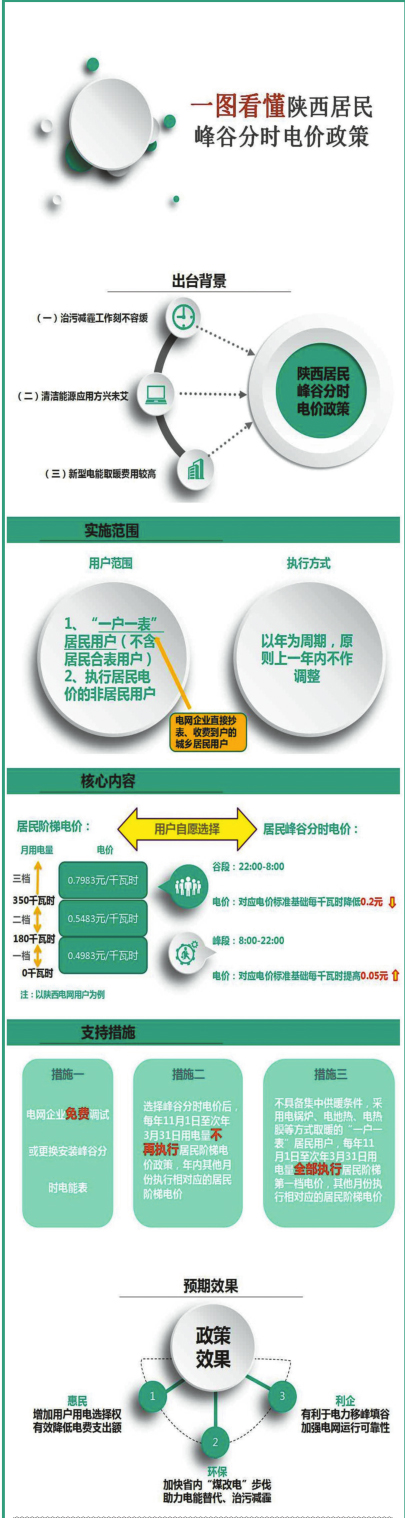 為落實國家和陜西省支持冬季清潔取暖,加快電能替代和鐵腕治霾工作要求,陜西省出臺居民峰谷分時電價政策。居民峰谷分時電價政策是指居民在用電高峰時段執行相對較高的電價,在用電低谷時段執行相對較低的電價,以此引導和鼓勵居民用戶參與電力移峰填谷,滿足居民電采暖、電儲能等個性化用電需求