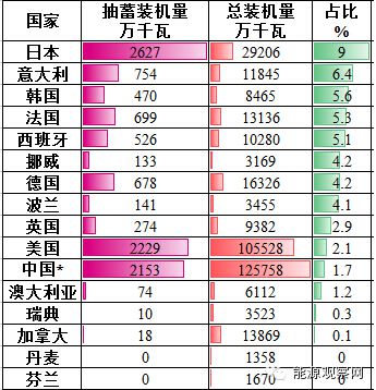 截止2013年我國抽水蓄能電站23座,發電裝機容量2153萬千瓦,約占水電裝機比重的8%,不到全國發電裝機總量的2%。這個比例算不算高呢?來看看國外的抽水蓄能的裝機比例都有多少,以下數據都來自IEA的統計。