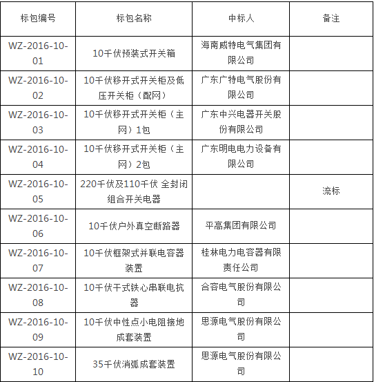 海南電網有限責任公司2016年第二批物資專項招標(招標編號:WZ-2016-10),經評標委員會評審、推薦,并經公示無異議,招標人確定以下單位為中標人,公告如下: