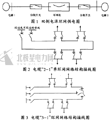 一般城市的配電網結構是指中壓配電網,即10kV電網的結構,早期建設的10kV配電線路多數是單輻射狀分布供電,一旦線路、設備或電源發生故障,容易導致全線停電,造成的損失和影響較大,因此按照省集團公司提出的規劃和要求,在城區配電網絡建設與改造中應考慮建立環網供電、開環運行的模式,如圖1 所示,一旦其中一側電源有故障或進行檢修工作,可以通過合上環網開關繼續對負荷進行供電,如果線路出現故障,通過線路上安裝的分段開關也可以把停電范圍大大減小。由于城區空間有限,且出于城市整體美觀的需要,使用電纜取代架空導線已成為城區配電網絡改造與建設的趨勢。城區的配電網絡應以電纜“2- 1”單環網絡結構作為主要接線方式,隨著負荷的增長可將單環網改造為“3- 1”環網結構,以提高線路的負載率。典型的電纜“2- 1”單環網絡結構和“3- 1”環網結構的接線如圖2、圖3 所示。從圖中可見,通過建立配電環網網絡,可有效減少,甚至避免停電,從而提高供電可靠性。
