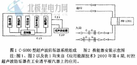 該廠凝汽器EH一1301應用的C-5000型防垢器主要由超聲波功率發生器(1)、傳輸電纜(2)和裝于凝汽器循環冷卻水入口管道內的壓電式換能器(3)組成如圖1所示。