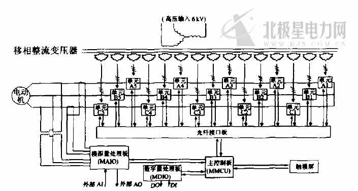 單元串聯(lián)多電平方式的高壓變頻器主要由3部分組成,主回路的輸入端是一個移相整流變壓器,它給每個逆變單元提供一個獨立的電源。每個逆變單元均是一個三相交流輸入、單相交流輸出的低壓變頻器,數(shù)個逆變單元的交流輸出依次串聯(lián),形成單相的高壓輸出,由3組這樣的逆變單元組形成了三相高壓逆變電源。這3組單元的其中一端短接形成三相電源Y型接法的中性點,另一端形成了高壓電源的輸出端;所有的單元由一個主控制器協(xié)調(diào)工作,同時實現(xiàn)變頻器和外部設(shè)備的接口。單元串聯(lián)多電平方式高壓變頻器的電路示意圖如圖1所示。