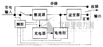1.1 在線式UPS不論市電是否正常,它都一直按照“市電輸入 整流一逆變 輸出”的順序進行,即由逆變器提供電源,同時對蓄電池組進行充電。只有在逆變器過載或故障時才改由旁路(市電)輸出,其工作原理如圖1所示。