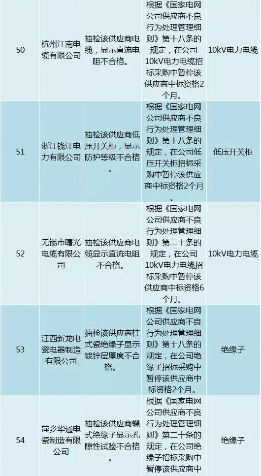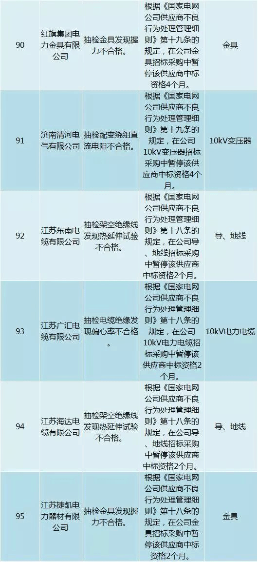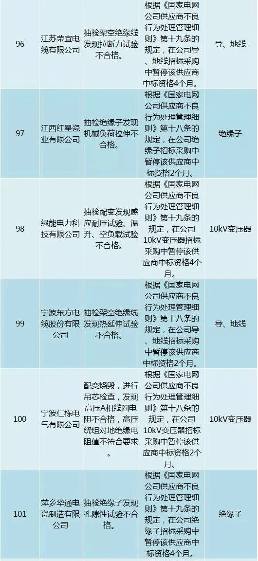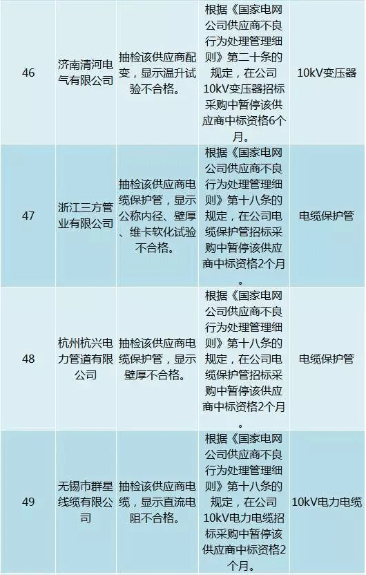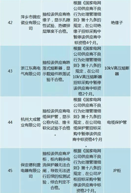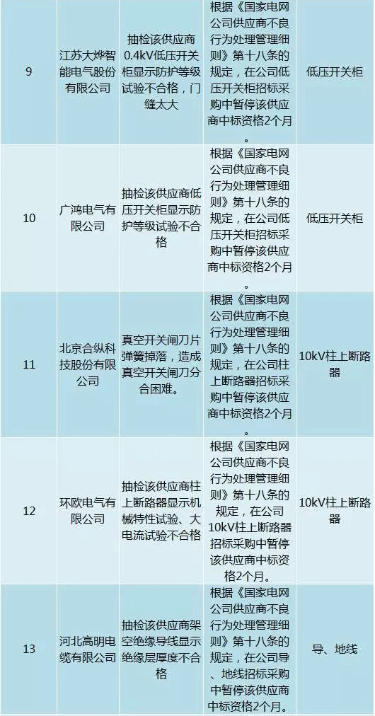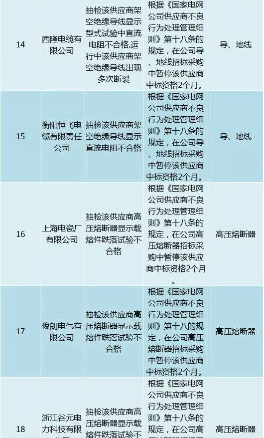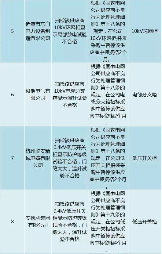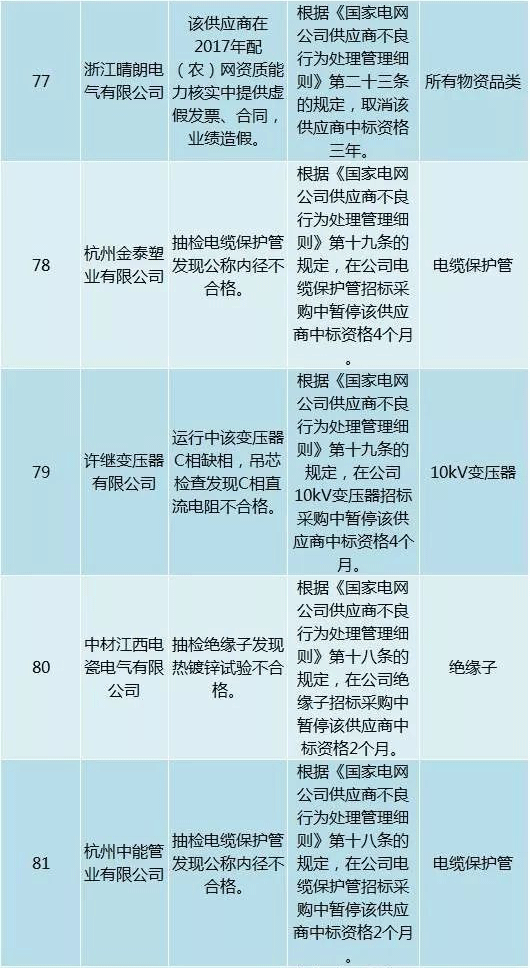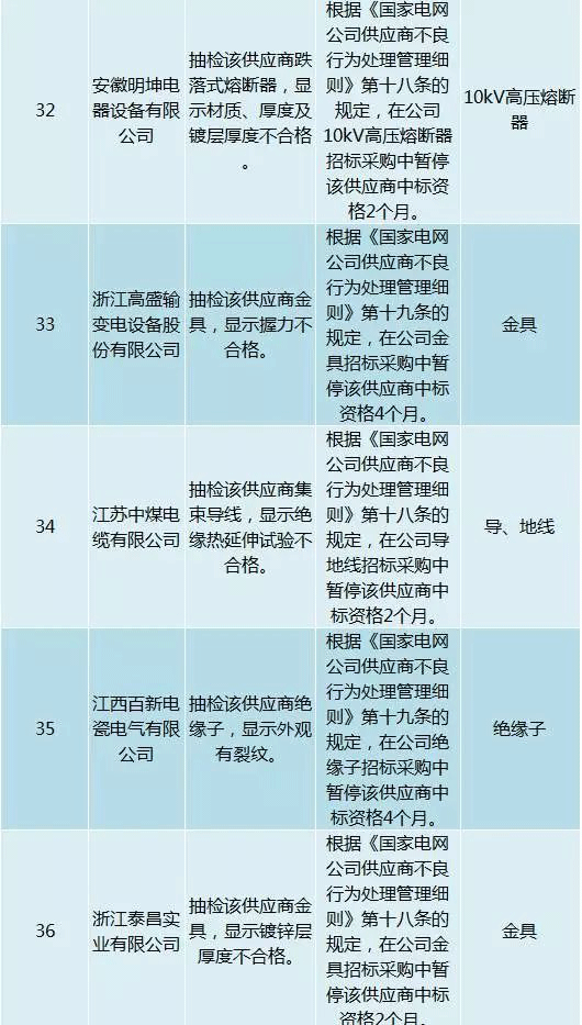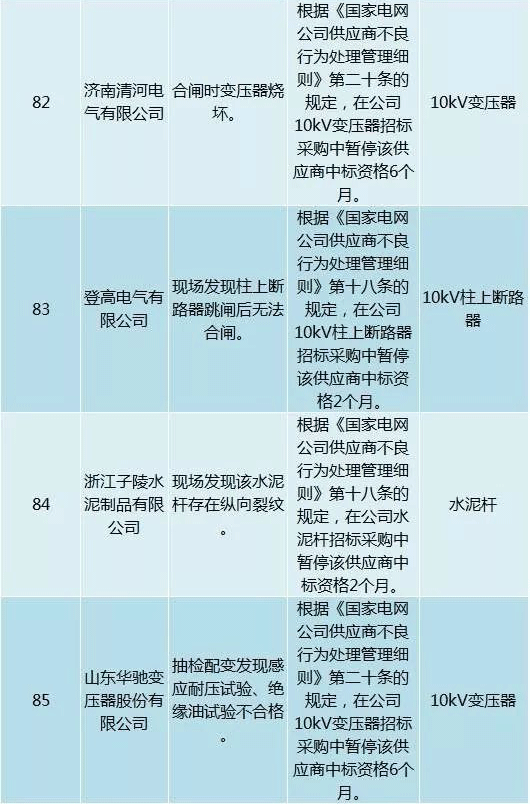 為促進供應商誠信履約,保證產品質量,確保電網建設順利進行及安全可靠供電,依據《國家電網公司供應商不良行為處理管理細則》(以下簡稱《細則》)的有關規定,對出現重大產品質量問題、履約不誠信等問題的供應商進行了處理。本次處理涉及10kv變壓器、高壓熔斷器等物資,具體處理情況如下: