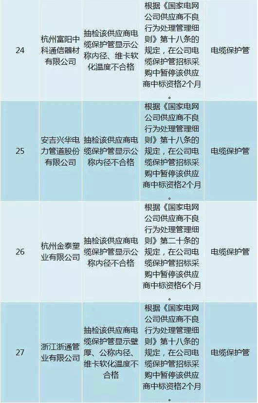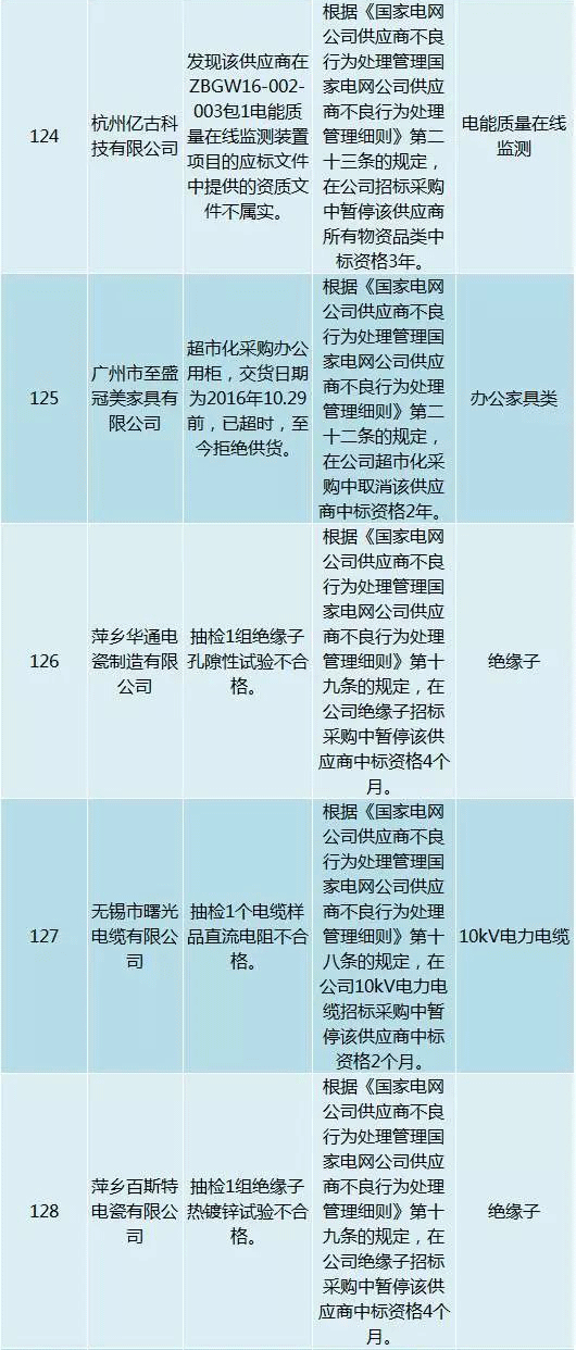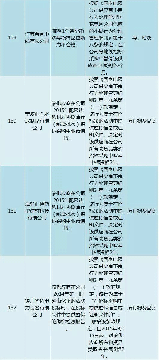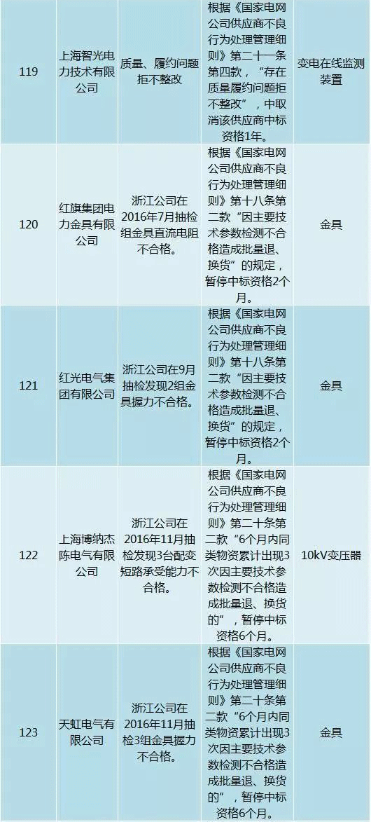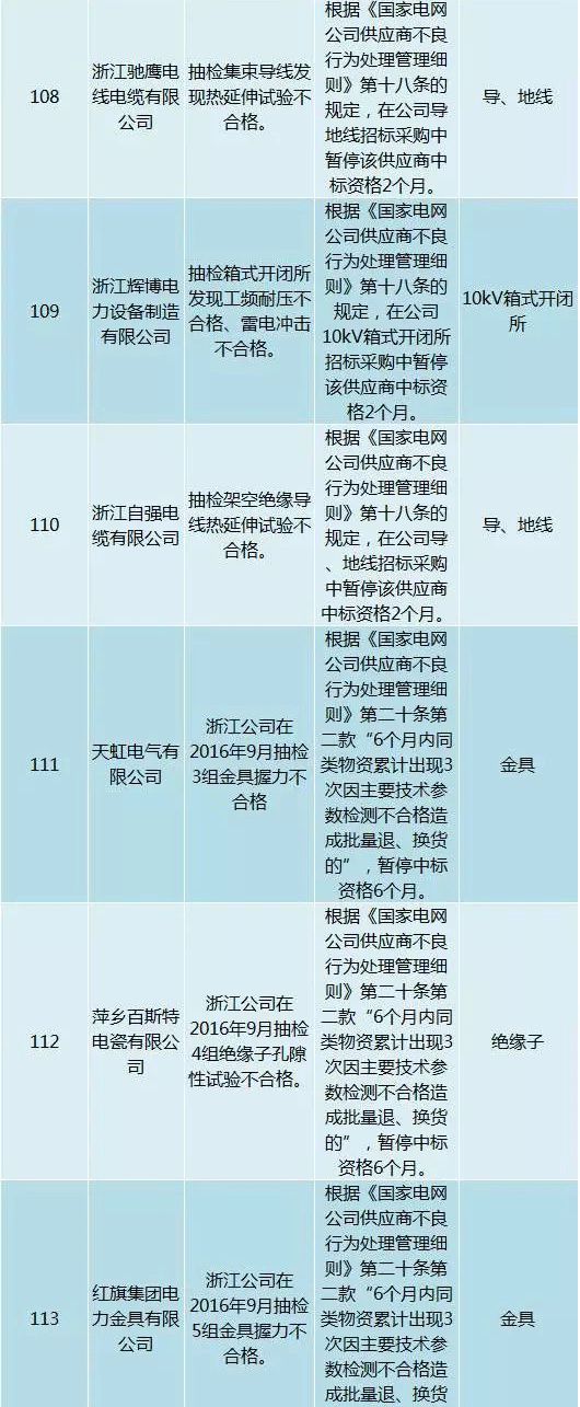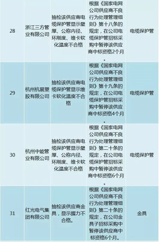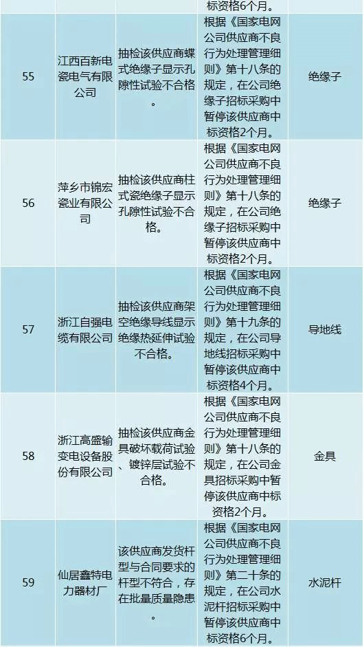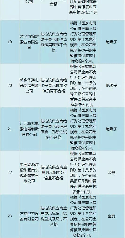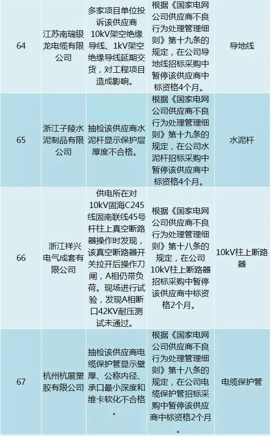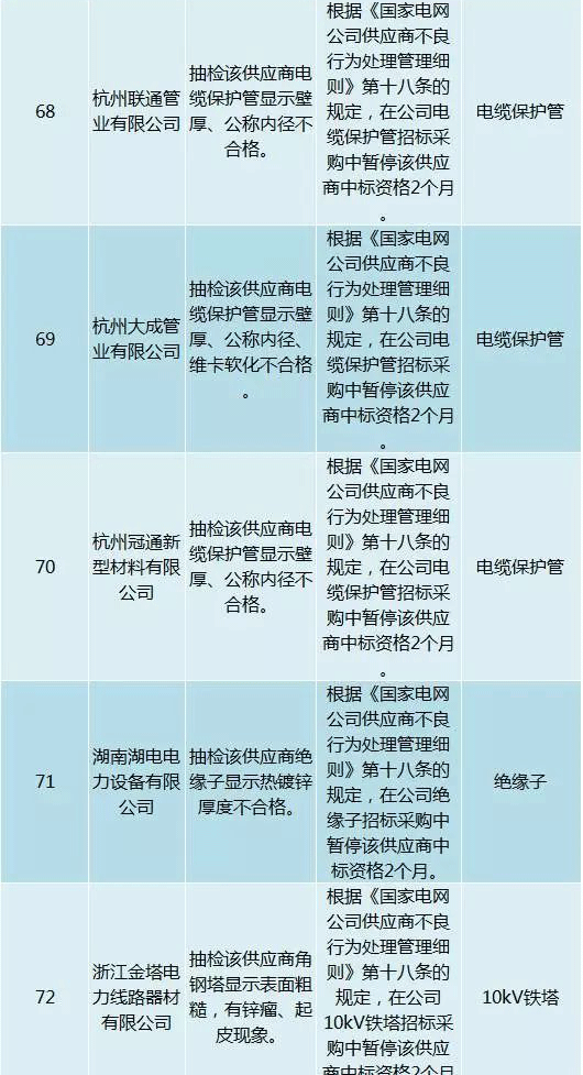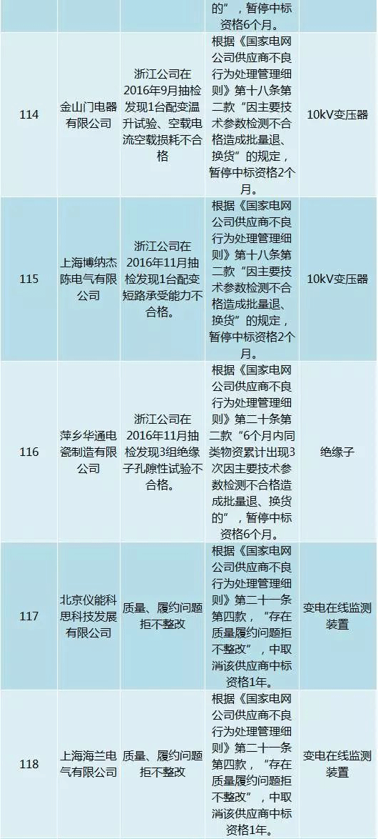 為促進供應商誠信履約,保證產品質量,確保電網建設順利進行及安全可靠供電,依據《國家電網公司供應商不良行為處理管理細則》(以下簡稱《細則》)的有關規定,對出現重大產品質量問題、履約不誠信等問題的供應商進行了處理。本次處理涉及10kv變壓器、高壓熔斷器等物資,具體處理情況如下: