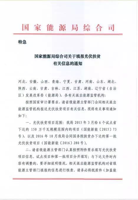 日前,國家能源局綜合司印發了《關于填報光伏扶貧有關信息的通知》,并在通知中要求:光伏扶貧的試點省份和擁有第一批光伏扶貧項目的省份需按要求填寫光伏扶貧項目信息,并于11月15日前上報。 以下為文件原文: