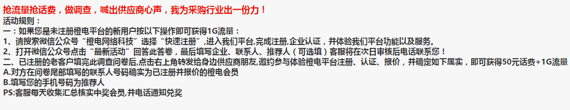 參與《橙電平臺供應商調查問卷》,搶1G流量+50元話費。