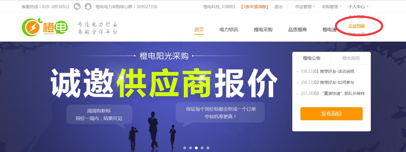 第一步:登陸橙電賬號,點擊在網站右上角【個人中心】—【企業檔案】